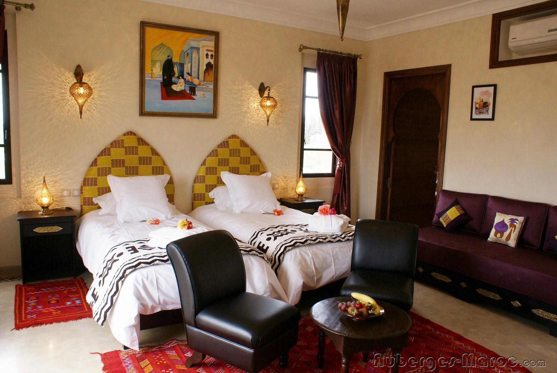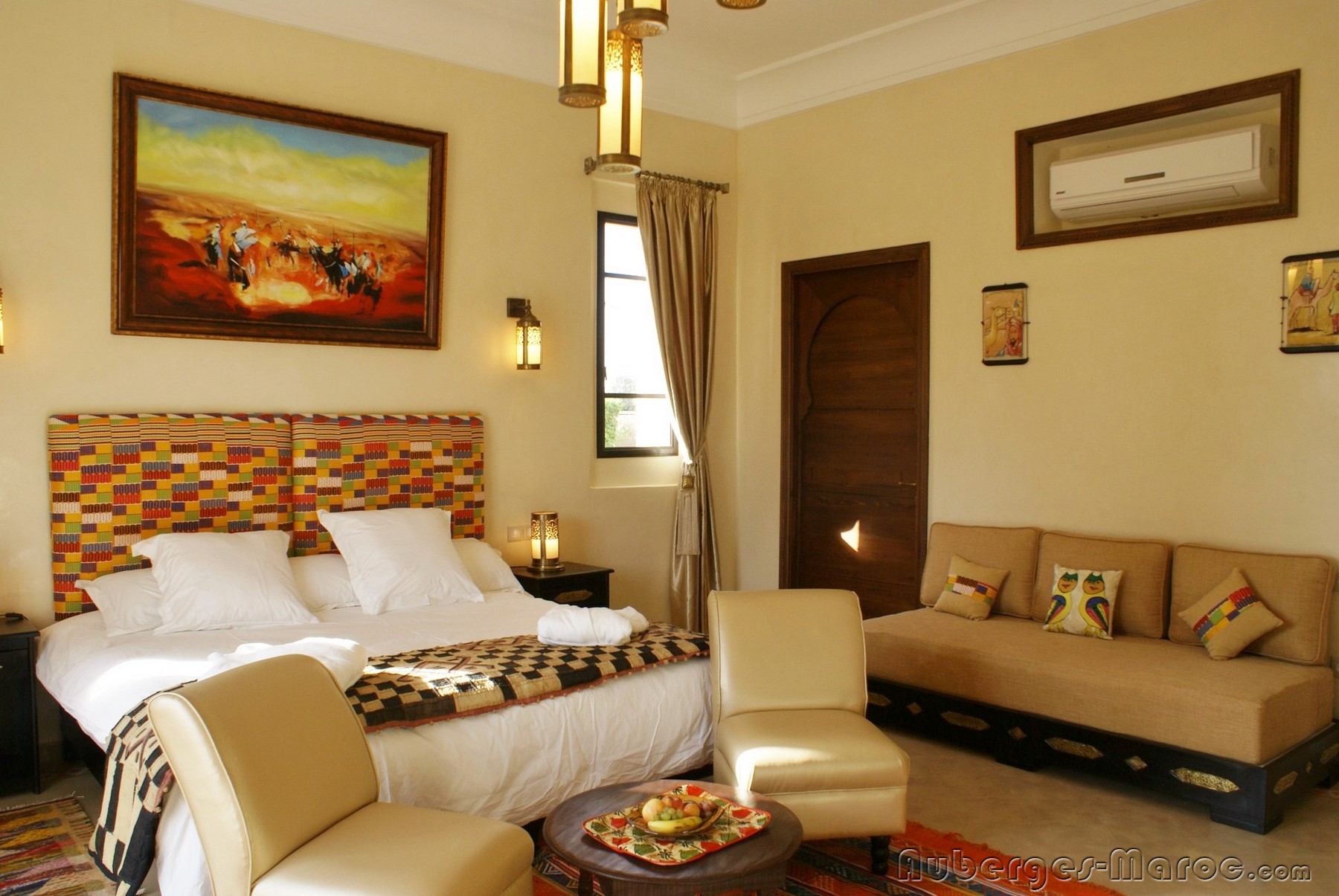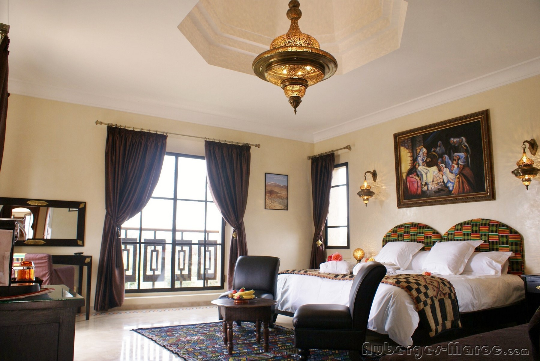 Splendide villa à proximité de Marrakech, la Kasbah Aâlma d'Or vous offre une piscine privée et un SPA (hammam/gommage, massages et soins esthétique).. Cette maison de vacances au Maroc avec 5 chambres d'hôtes est le lieu idéal pour une halte de 1 ou 2 jours avant de partir pour Ouarzazate ou au retour d'une excursion dans le désert. La fourchette de prix d'une chambre est entre 56 € et 116 € en fonction de la chambre et de la saison - nous contacter.